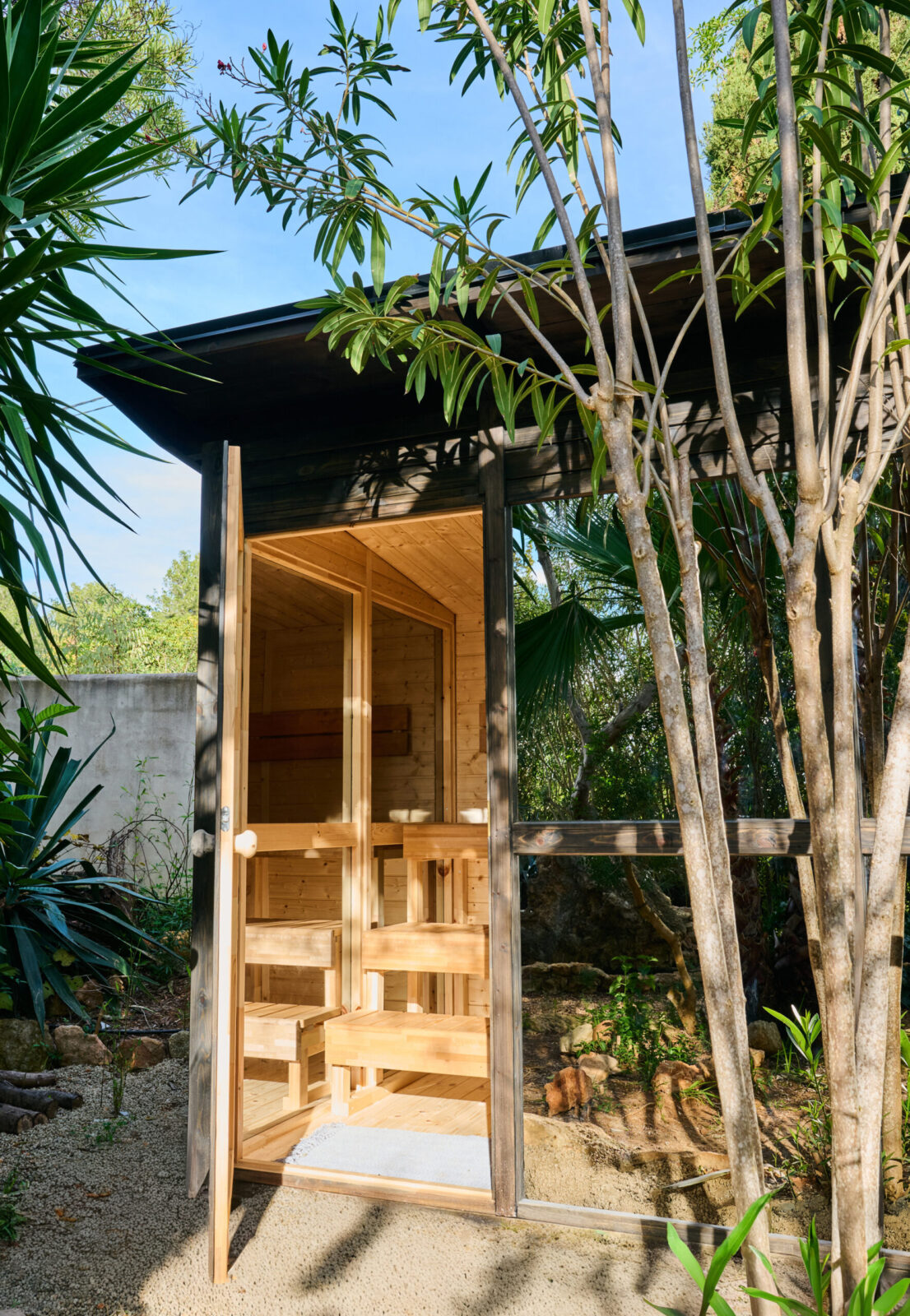 Step outside and discover your own private paradise: a saltwater swimming pool surrounded by tropical gardens, seven inviting outdoor lounge areas, a wide rooftop terrace with a pergola, and a private sauna perfect for wellness, relaxation, and recharging after a beach day. Here, sunsets and mountain views set the scene for unforgettable evenings.
